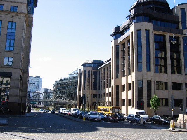 English: Financial District. The site of  Princes Street railway station is now the financial centre of  Edinburgh. The chrome and glass on display here includes the Clydesdale Bank and Standard Life Head Office. The main road in from the West runs through the picture.