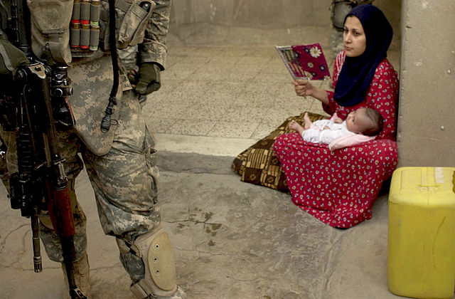 An Iraqi woman looks on as U.S. Army Soldiers from 1st Battalion, 23rd Infantry Regiment, 3rd Stryker Brigade Combat Team search the courtyard of her house during a cordon and search in Ameriyah, Iraq. |