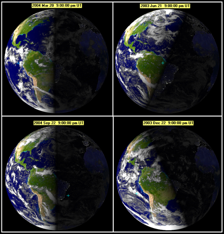 These images shows the Earth's sunlight on the equinoxes and solstices at exactly the same time of day ( UT).