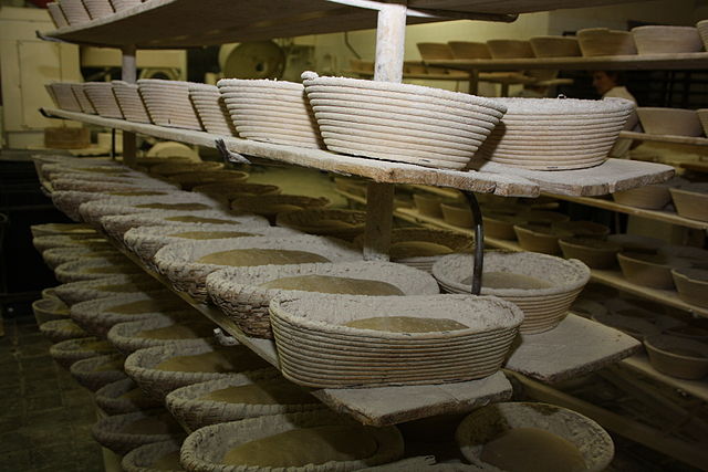 Česky: Postup výroby chleba v Česku. Těsto umístěné v ošatkách