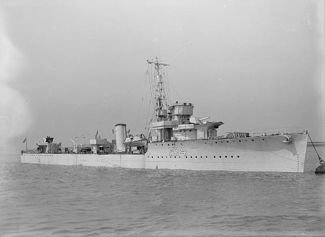 British destroyer HMS VELOX At a buoy (Admiralty V class, after LRE destroyer escort refit - removed first funnel and two guns)