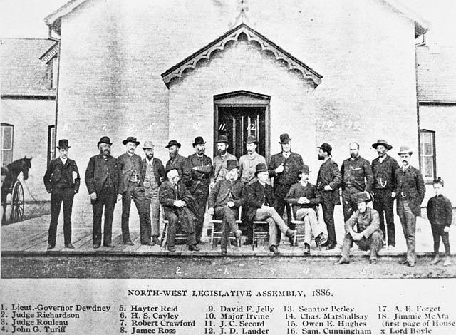 English: Legislative Assembly of the Northwest Territories members outside of the territorial government building in Regina, Saskatchewan.
