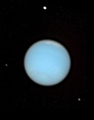 Neptune, natural colour view, with Proteus (top), Larissa (lower right) and Despina (left), from Hubble space telescope