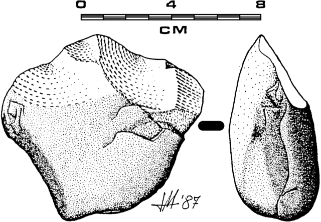 Français : Galet taillé en quartzite façonné avec taille en une seule des faces du galet. Cette piece fût ramassé d'une terrace fluviatile de la riviere du Trabancos (Valladolid, vallée du Duero) et a etté daté dans l'Acheuleen (Paleolithique Inferieur)