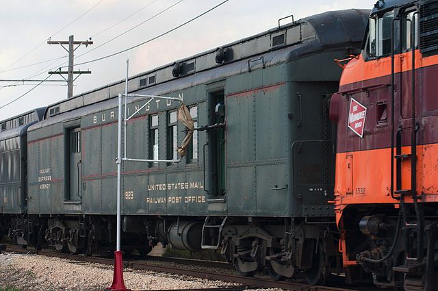 Traveling at more than 40 MPH, local stations wold transfer their outgoing mail to the Railway Post Office for sorting and delivery. This shot was the exact moment of transfer....lets hope there is nothing fragile in there! |
