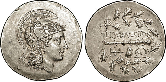 Titulature avers : Anépigraphe. Description avers : Tête casquée d'Athéna à droite, coiffée du casque attique à cimier et à triple aigrette, orné d'un Pégase volant et de quatre protomés de chevaux. Description revers : Massue dans une couronne de chêne ; au-dessous de la massue, petite chouette debout de face et deux monogrammes complexes. Légende revers : HRAKLEWTWN/ (MIAT) - (WUR)