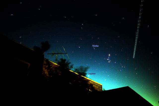 Asteroid  Vesta. The picture is a single frame. The colors were adjusted in PS.  Star chart for Vesta finder. Two dotted lines on the right of the image are stroboscopic lights from an airplane. It shows as two lines because of the time exposure. The white dots are the lights flashing. |