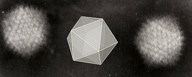 English: Two adenoviruses with a cartoon to show their icosahedral structure