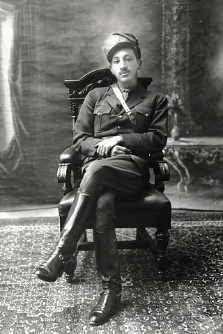 English: Studio photograph of Mohammad Zâher Khân, son of Mhd Nâder Shâh, in military uniform, seated in a heavy carved armchair. Accession number: 2006.1387 Inventory number: NA 28
