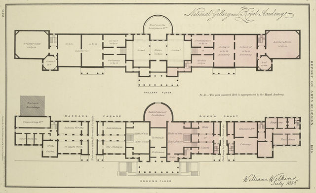 A plan of the National Gallery in London signed by the architect William Wilkins in 1836. Initially the Gallery shared the building with the Royal Academy, which occupied the rooms coloured pink. The building shown here is just the front section of the modern complex, which is now several times larger, overlooking Trafalgar Square. This plan is from the Crace Collection at the British Library and the annotations can more easily be read on the zoomable version on the Library's site  here.
