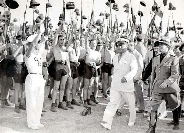 Picture of Benito Mussolini and Fascist Blackshirt youth in 1935 in Rome. |