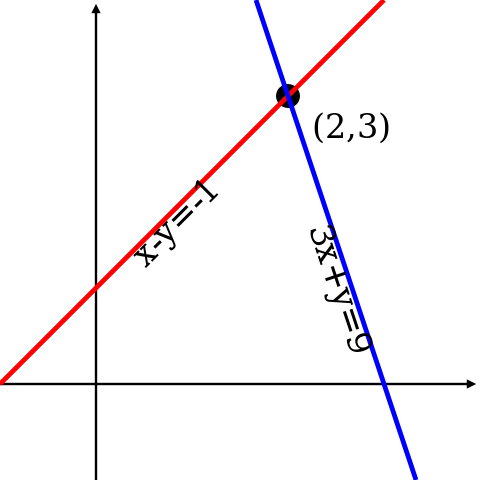The graphs of the linear equations x – y = –1 and 3x + y = 9. The two lines intersect at the point (2, 3), which is the unique solution for the system of equations. NB: A minus sign is missing on the red curve in the figure |