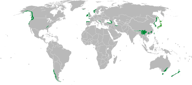 English: A map showing the areas where temperate rain forests can be found throughout the world.