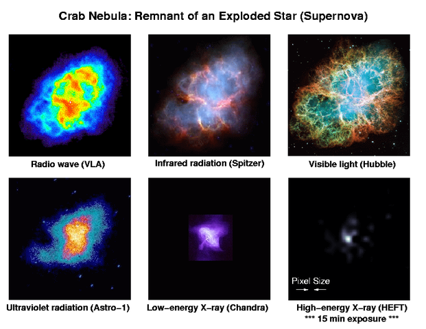 This is the Crab Nebula in various energy bands, including a hard X-ray image from the HEFT data taken during its 2005 observation run. The angular resolution of HEFT is about 1.5′. Each image is 6′ wide.