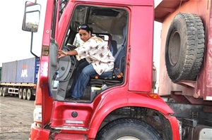 English: Oumalkaire Omar Djama driving a heavy weight truck at her work place Al Gamil, the largest construction company in Djibouti.