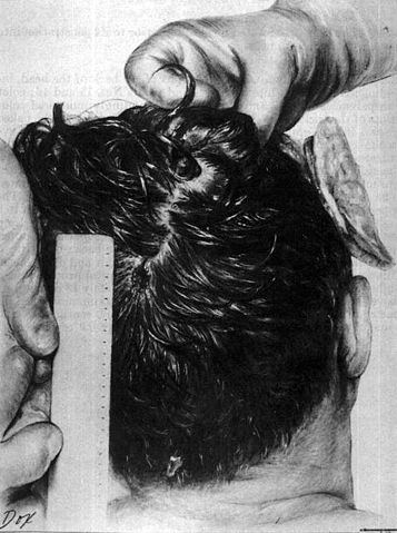 Drawing depicting the posterior head wound of U.S. President John F. Kennedy. The hand at the top is holding a portion of his scalp in place. Made by medical illustrator Ida G. Dox from an autopsy photograph, and published as Figure 13 on page 104 of volume 7 (Medical and Firearms Evidence) of the Appendix to Hearings Before the Select Committee on Assassinations of the U.S. House of Representatives (1979).
