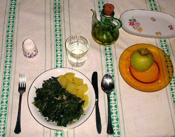 English: Aragonese cuisine. Borage slightly boiled and sauteed with garlic served with boiled potatoes.
