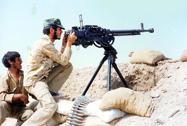 English: Iranian soldier shooting with heavy machine gun DShk in front line of Iran-Iraq War during Operation Karbala 5.