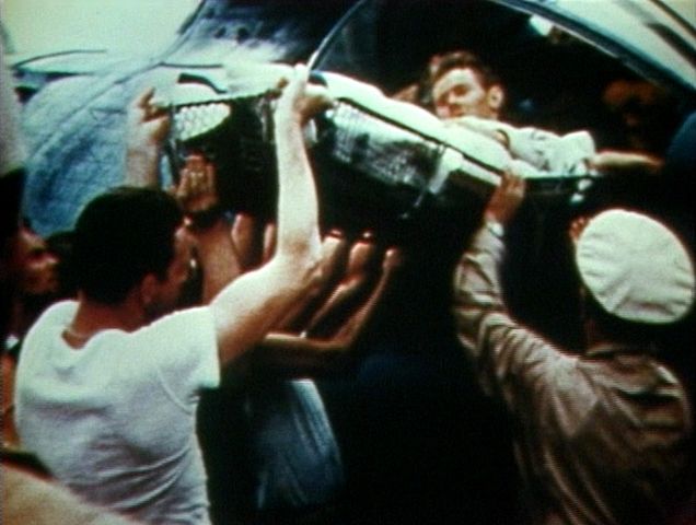 English: An injured or exhausted rescued U.S. Navy flight crew man is taken on a stretcher out of a Consolidated PBY-5 Catalina on Midway Islands, after the Battle of Midway in June 1942.