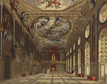 English: St George's Hall Windsor from W.H. Pyne's Royal Residences (1819), plate 20. This shows the baroque style of the work carried our at Windsor for Charles II by architect Hugh May, painted Antonio Verrio, carver Grinling Gibbons and others. St George's Hall was redecorated in the early 19th century, but several smaller interiors from this period survive.