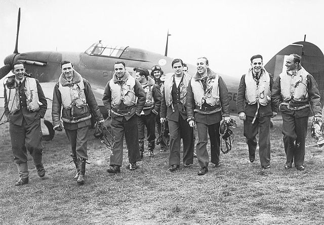 Polski: 1940: Piloci Dywizjonu 303. Od lewej P/O  Ferić, F/Lt  Kent, F/O Grzeszczak, P/O Radomski, P/O  Zumbach, P/O  Łukuciewski, F/O  Henneberg, Sgt. Rogowski, Sgt. Szaposznikow