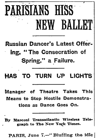 The New York Times on the bad reception of "The consecration of spring" by Igor Stravinsky, performed by the Russian Ballet in Paris. The article states that it uses transatlantic marconi wireless technology to report quasi live from Europe. |