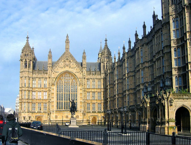 View of Old Palace Yard and part of the West Front of the Palace of Westminster (Houses of Parliament) in London. The bronze statue of King Richard I can be seen in front of the South Window of Westminster Hall, and the porte-cochère of Peers' Entrance is to the right. The concrete barriers restricting access to Old Palace Yard occupy the foreground; the top of the Clock Tower ( Big Ben) can be seen behind the corner turret in the middle. |