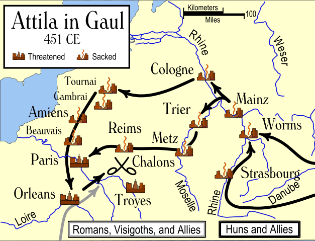 English: An historical map showing the Hun invasion of Gaul in 451 CE (AD), leading to the Battle of Chalons. The generally accepted routes are shown, along with the larger cities threatened or sacked by the Huns.