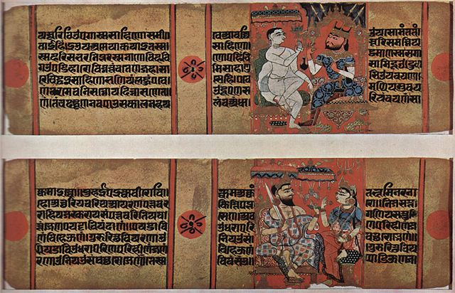 Deutsch: Kalpasûtra und Kâlakâchârya Kathâ-Manuskript, Szene oben: Kâlakâ und der Saka-König, Szene unten: Balamitra und Gemahlin