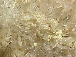 English: Photograph of a Celestine specimen from the Machow Mine, Poland taken by Dlloyd. Thin, transparent clear terminated celestine crystals, which measure up to 1.7 cm (0.7") in length, on bright yellow native sulphur.