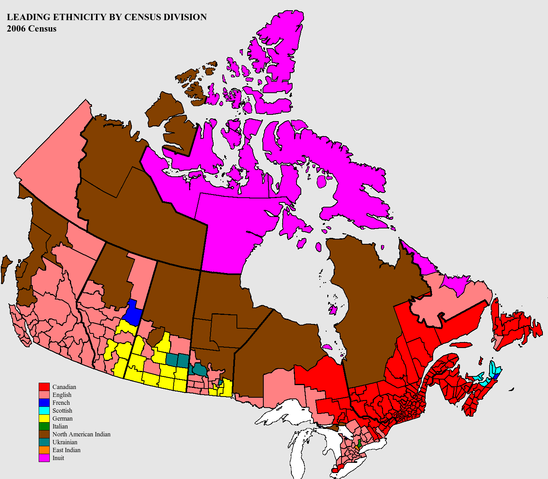 English: Map of the dominant self-identified ethnic origins of ancestors per census division. Actual physical origins of ancestors may be different.