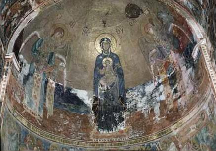 English: Gelati Mother of God Church (Georgia). An altar conch mosaic. 1125-1130. "The Glory of the Theotokos". The Virgin surrounded by the Archangels Michael and Gabriel.