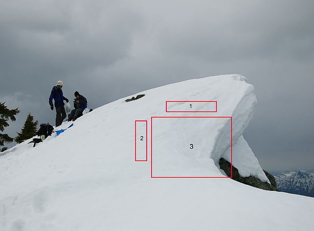 Summit of Mount Windsor, British Columbia, showing a cornice (overhang) of snow that is about to collapse. The original photo is annotated as follows: 1) "Cracks, just before it gave way" 2) "The new edge after the cornice fall" 3) "This area fell off right after I took this shot" |