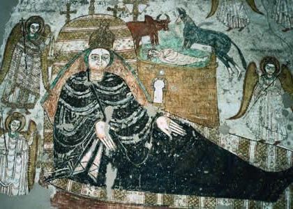 English: fresco in the cathedral in Faras, Sudan, showing the birth of Jesus - NB, image is reversed from the original