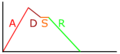 Image of how the four parameters A, D, S and R change the shape of an inverted ADSR envelope.
