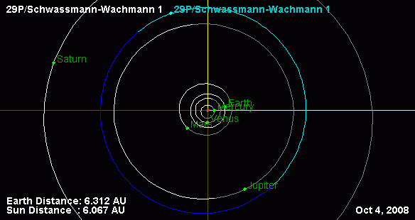 The quasi-circular orbit of  29P/Schwassmann-Wachmann compared to  Jupiter and  Saturn. |