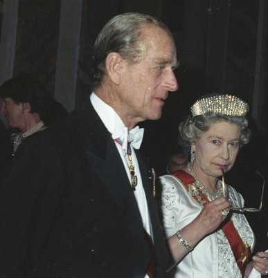 English: Cropped version of File:Bundesarchiv Bild 199-1992-089-19A, Britische Königin Elisabeth II. in Brühl.jpg: Queen Elizabeth II and Prince Philip in Germany, October 1992