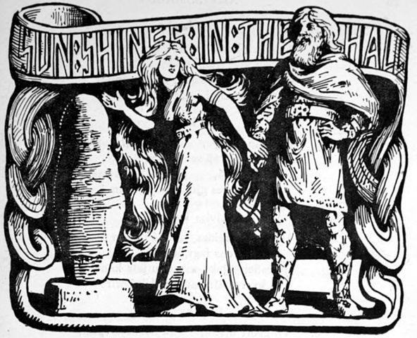 The dwarf Alvíss has turned to stone. Thor and Þrúðr hold hands. The list of illustrations in the front matter of the book gives this one the title Sun shines in the Hall. |