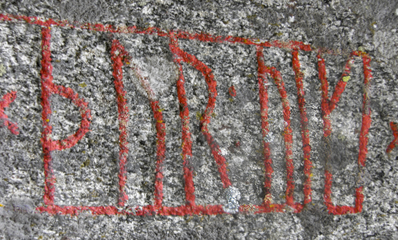 English: Detail of the runestone in Velanda (Vg 150, RAÄ-nr Väne-Åsaka 8:1), Väne-Åsaka parish, Väne hundred, Trollhättan municipality, Västergötland, Sweden. Here the inscription "þur uiki" > "Þórr vigi" > "Thor vigi" is shown, which is a Viking way of wishing for the blessing of the Old Norse god Thor.