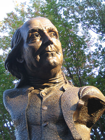 Description Keys To Community, a nine-foot bronze sculpture of Benjamin Franklin by James Peniston, installed in 2007 in Girard Fountain Park in Philadelphia, Pennsylvania.