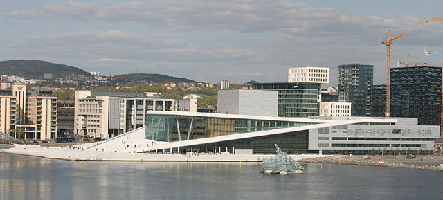 Norsk bokmål: Operaen i Oslo (Snøhetta arkitekter) sett fra sjøsida med skulpturen «She Lies» av Monica Bonvicini i vannet foran.