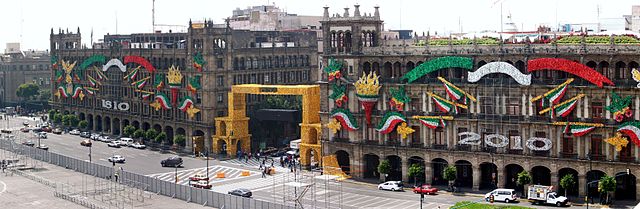 English: Federal District buildings at the Zócalo in Mexico City seen from rooftop restaurant of Hotel Majestic