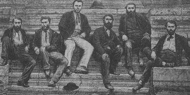 scan by User: Markalexander100 of 1885 engraving of the members of the French Mekong Expedition at Angkor; from Voyage d'exploration en Indo-Chine; from left: Garnier, Delaporte, Joubert, Thorel, de Carne and Lagree |