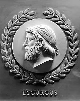Lycurgus marble bas-relief, one of 23 reliefs of great historical lawgivers in the chamber of the U.S. House of Representatives in the United States Capitol. Sculpted by C. Paul Jennewein in 1950. Diameter 28 inches. |