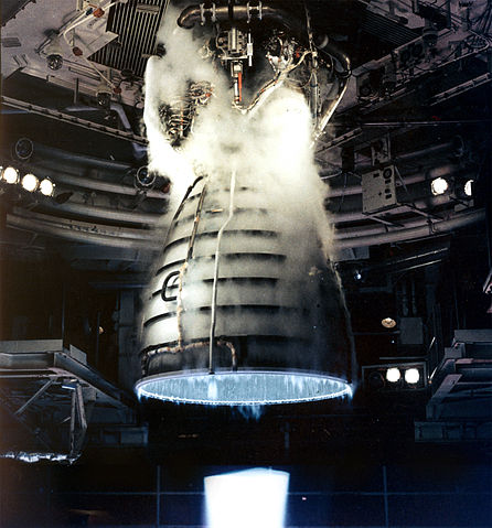 A remote camera captures a close-up view of a Space Shuttle Main Engine during a test firing at the John C. Stennis Space Centre in Hancock County, Mississippi.