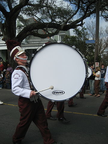 Description Bass drummer in marching band, Krewe of Thoath parade, Magazine Street, New Orleans Carnival.