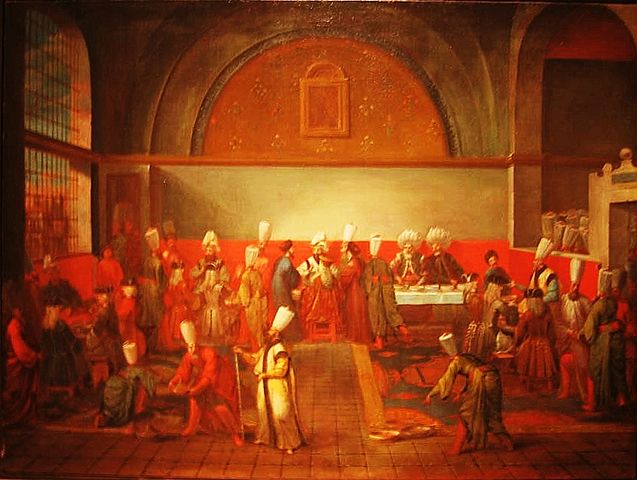 Foreign ambassadors being received at the Topkapı Palace in Istanbul during the reign of Sultan  Ahmed III. Painting by  Jean-Baptiste van Mour, 1725.  Pera Museum, Istanbul.