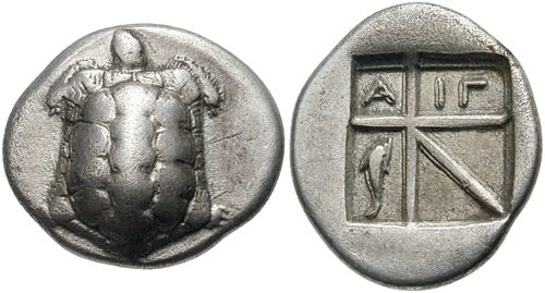 - Incuse, Α Ι Γ, dolphin in angles.