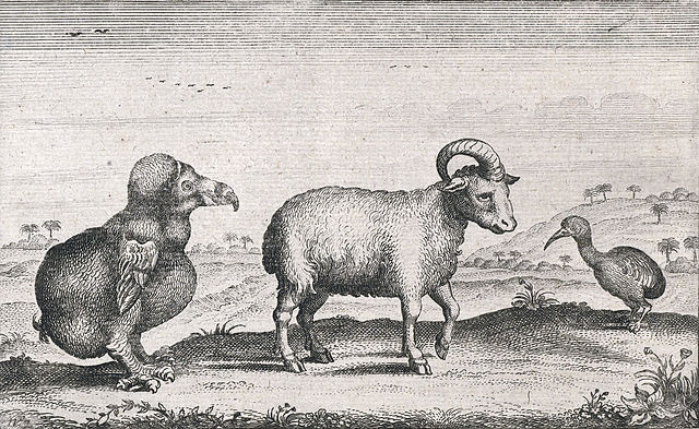 Dodo, one-horned sheep, and Mauritius Red Hen (Aphanapteryx bonasia), depiction by Pieter van den Broecke from the year 1617.