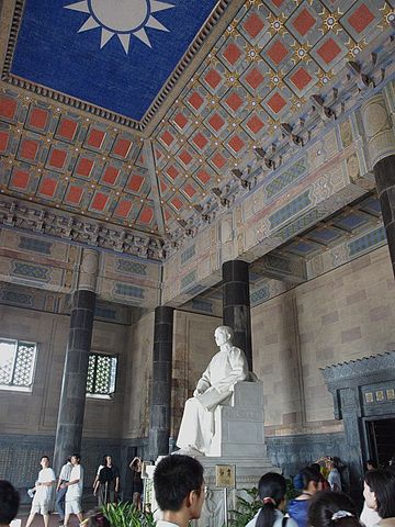 Deutsch: Statue von Sun Yat-sen in dem gleichnamigen Mausoleum in Nanjing, VR China. Das Deckenmoasaik zeigt die Fahne der von ihm gegründeten Kuomintang Partei.
